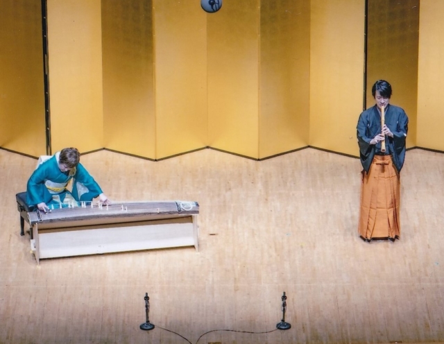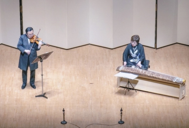 お箏とバイオリンとの共演は初めて聞きましたが、お互いが競い合うような迫力があり、またジャムセッションを思わせるような演奏だと、これまた勝手なことを思いながら聞きました。聞く前の私の想像をはるかに超えて、お箏の音が広がって別の世界を作り出しているようでした。